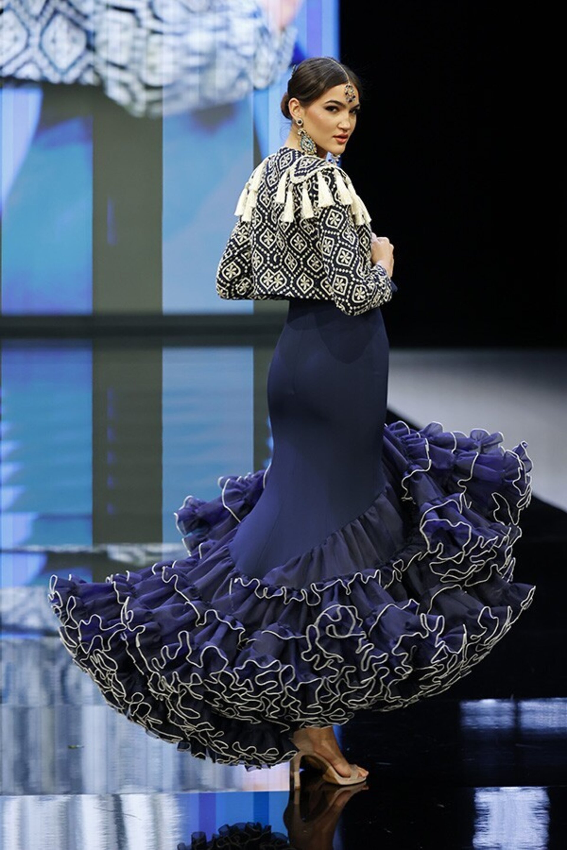 El vestido se complementa con una torera de lina azul marino, bordada con hilo de